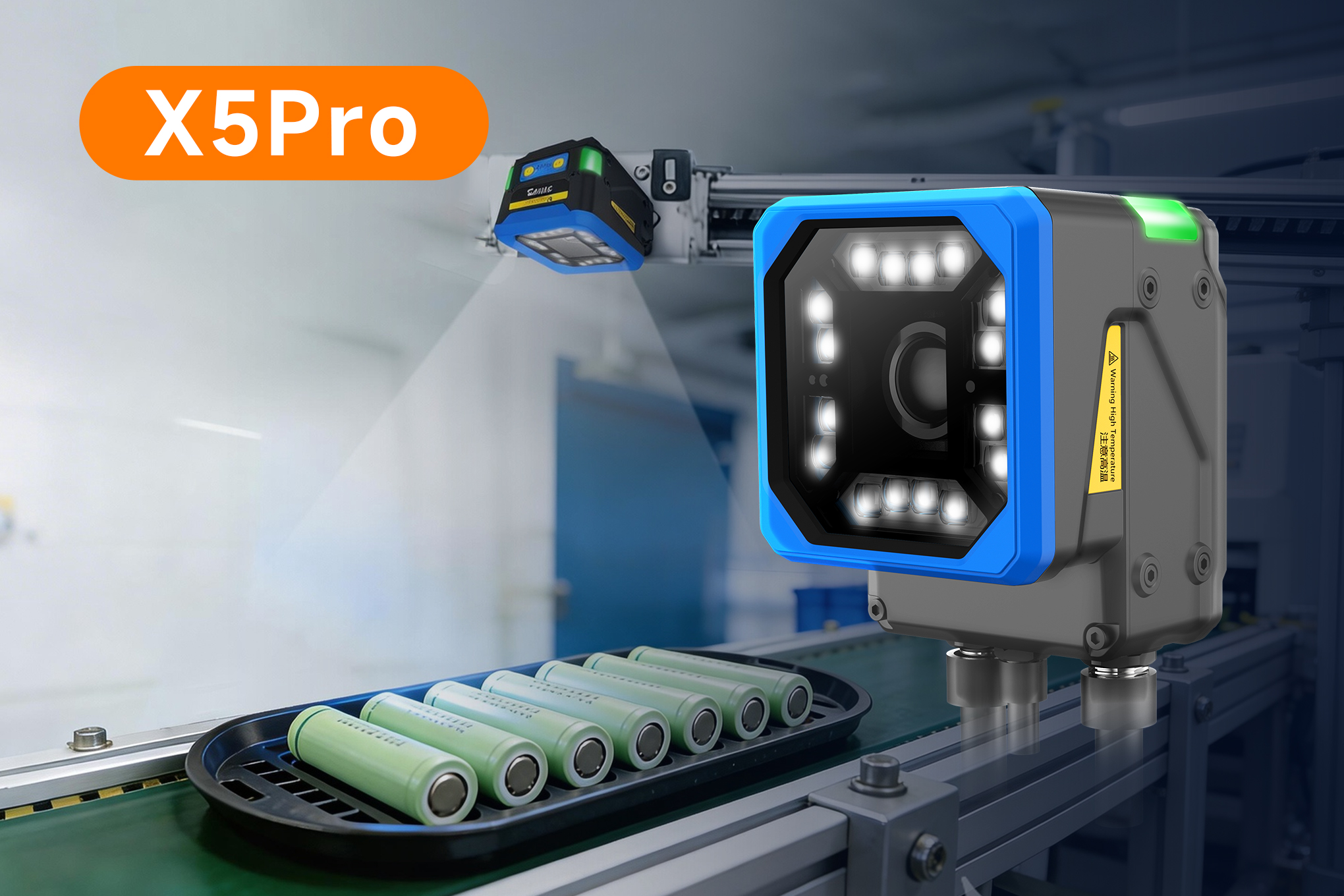 在锂电池生产的前段工序,数以百计的电芯紧密码放在托盘上,每个电芯表面的二维码(通常是DM码)承载着从材料批次到工艺参数的全流程追溯信息。然而,由于托盘治具公差、电芯放置偏移或胶带粘贴位置不一致,导致每个电芯上的条码位置并不统一——有的居中,有的偏左,有的靠近边缘。传统固定式读码器视野有限,必须精准对准每个码的位置,一旦位置变化便频繁漏读,严重影响生产节拍与数据完整性。