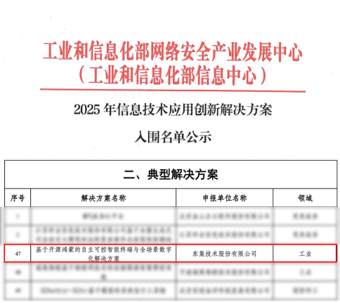 近日,工业和信息化部网络安全产业发展中心正式公布2025年信息技术应用创新解决方案入选名单。东集技术股份有限公司(下称“东集”)申报的“基于开源鸿蒙的自主可控智能终端与全场景数字化解决方案”,从全国963家单位提交的1219个有效案例中脱颖而出,成功入选国家级信息技术应用创新典型解决方案。